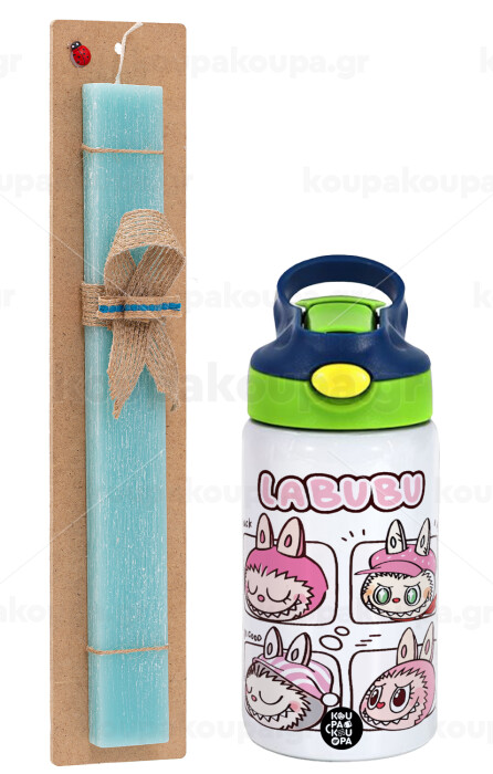 Labubu pink, Easter Set, Children's thermal stainless steel bottle with safety straw, green/blue (350ml) & aromatic flat Easter candle (30cm) (TURQUOISE)