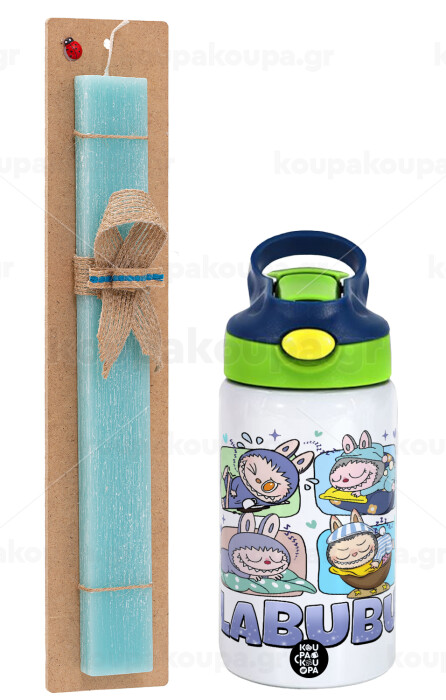Labubu, Easter Set, Children's thermal stainless steel bottle with safety straw, green/blue (350ml) & aromatic flat Easter candle (30cm) (TURQUOISE)