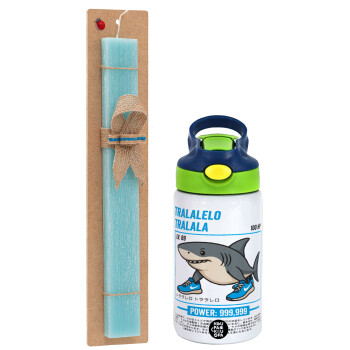 Tralalero Tralala, Easter Set, Children's thermal stainless steel bottle with safety straw, green/blue (350ml) & aromatic flat Easter candle (30cm) (TURQUOISE)
