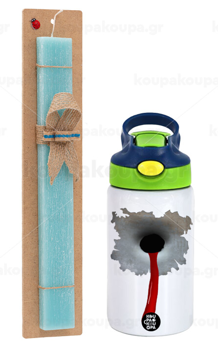 Bullet holes, Easter Set, Children's thermal stainless steel bottle with safety straw, green/blue (350ml) & aromatic flat Easter candle (30cm) (TURQUOISE)