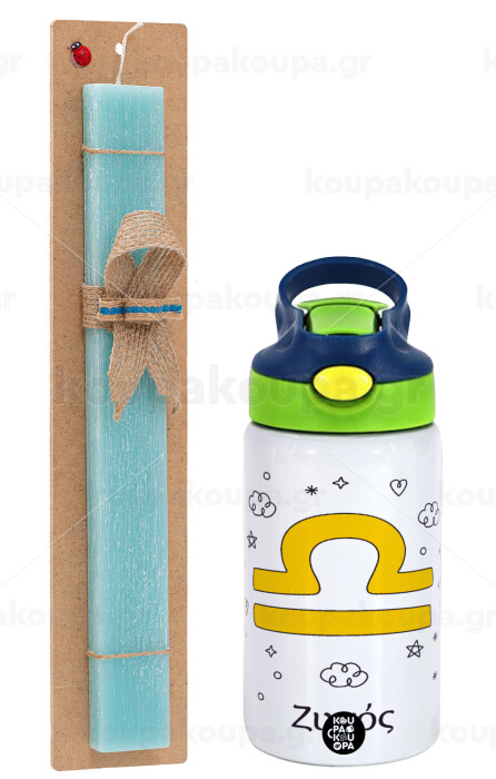 Ζώδια Ζυγός, Easter Set, Children's thermal stainless steel bottle with safety straw, green/blue (350ml) & aromatic flat Easter candle (30cm) (TURQUOISE)