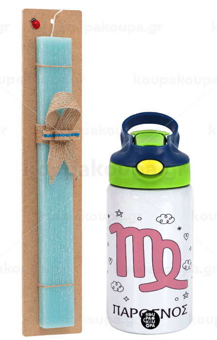 Ζώδια Παρθένος, Easter Set, Children's thermal stainless steel bottle with safety straw, green/blue (350ml) & aromatic flat Easter candle (30cm) (TURQUOISE)