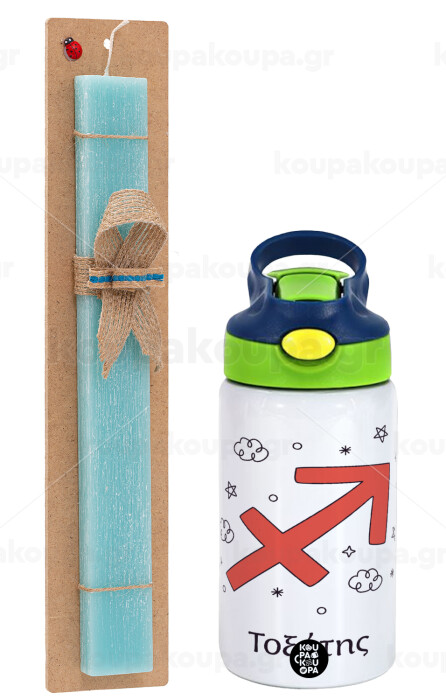 Ζώδια Τοξότης, Easter Set, Children's thermal stainless steel bottle with safety straw, green/blue (350ml) & aromatic flat Easter candle (30cm) (TURQUOISE)