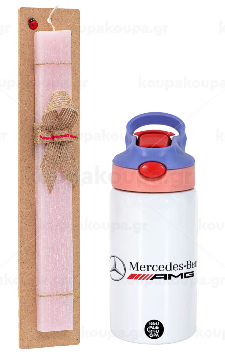 AMG Mercedes, Easter Set, Children's thermal stainless steel water bottle with safety straw, pink/purple (350ml) & Easter scented flat candle (30cm) (PINK)