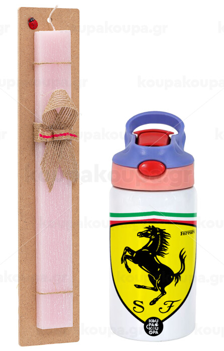 Ferrari, Easter Set, Children's thermal stainless steel water bottle with safety straw, pink/purple (350ml) & Easter scented flat candle (30cm) (PINK)