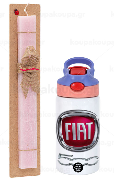 FIAT 500, Easter Set, Children's thermal stainless steel water bottle with safety straw, pink/purple (350ml) & Easter scented flat candle (30cm) (PINK)