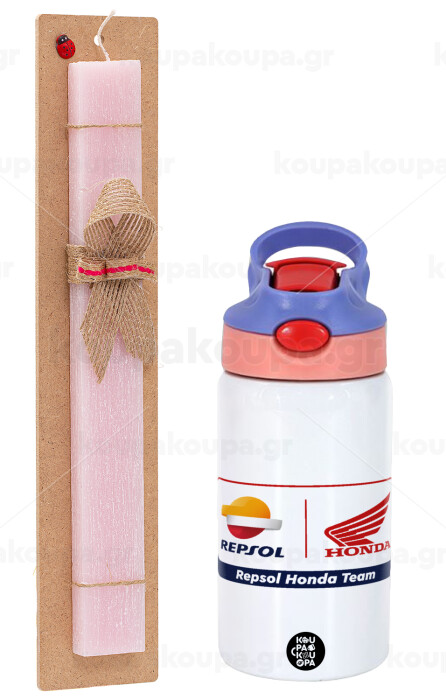 Honda Repsol Team, Easter Set, Children's thermal stainless steel water bottle with safety straw, pink/purple (350ml) & Easter scented flat candle (30cm) (PINK)