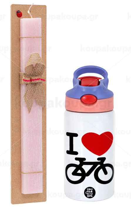 I love Bike, Easter Set, Children's thermal stainless steel water bottle with safety straw, pink/purple (350ml) & Easter scented flat candle (30cm) (PINK)