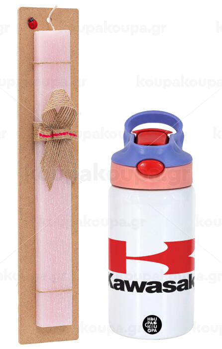 Kawasaki, Easter Set, Children's thermal stainless steel water bottle with safety straw, pink/purple (350ml) & Easter scented flat candle (30cm) (PINK)