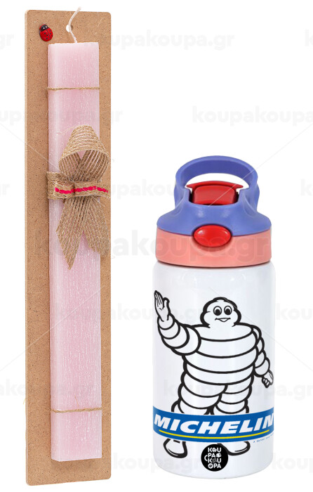 Michelin, Easter Set, Children's thermal stainless steel water bottle with safety straw, pink/purple (350ml) & Easter scented flat candle (30cm) (PINK)