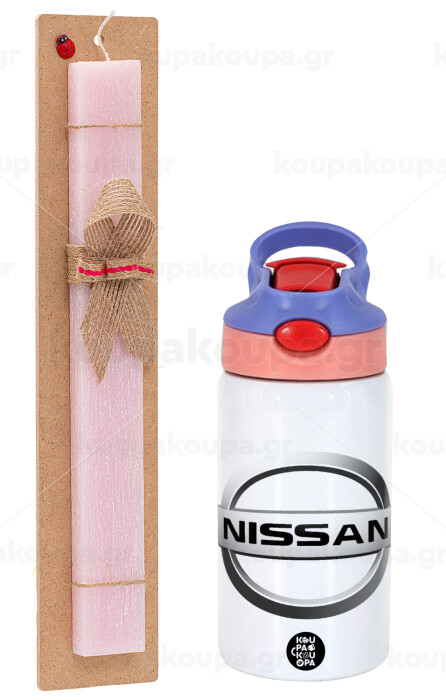 nissan, Easter Set, Children's thermal stainless steel water bottle with safety straw, pink/purple (350ml) & Easter scented flat candle (30cm) (PINK)