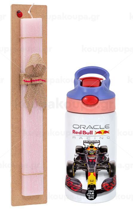 Redbull Racing Team F1, Easter Set, Children's thermal stainless steel water bottle with safety straw, pink/purple (350ml) & Easter scented flat candle (30cm) (PINK)