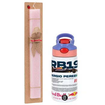Redbull Sergio Perezi, Easter Set, Children's thermal stainless steel water bottle with safety straw, pink/purple (350ml) & Easter scented flat candle (30cm) (PINK)