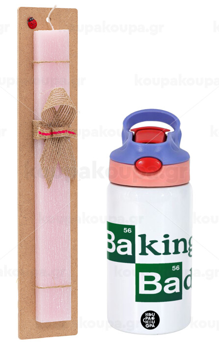Baking Bad, Easter Set, Children's thermal stainless steel water bottle with safety straw, pink/purple (350ml) & Easter scented flat candle (30cm) (PINK)