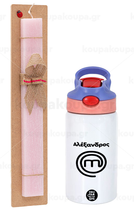 Master Chef Greece, Easter Set, Children's thermal stainless steel water bottle with safety straw, pink/purple (350ml) & Easter scented flat candle (30cm) (PINK)