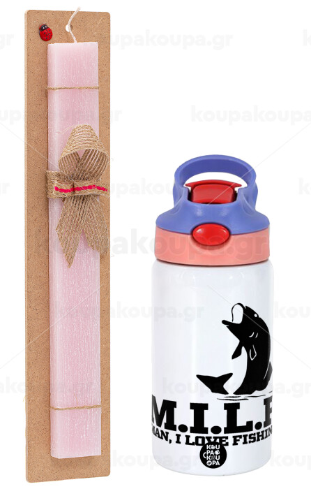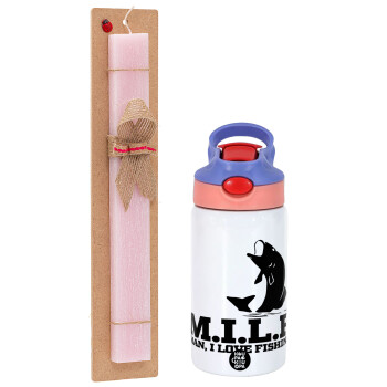 M.I.L.F. Mam i love fishing, Easter Set, Children's thermal stainless steel water bottle with safety straw, pink/purple (350ml) & Easter scented flat candle (30cm) (PINK)