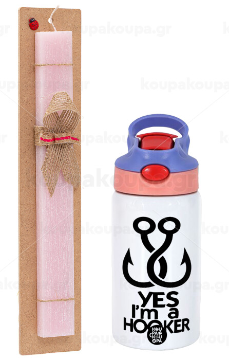 Yes i am Hooker, Easter Set, Children's thermal stainless steel water bottle with safety straw, pink/purple (350ml) & Easter scented flat candle (30cm) (PINK)