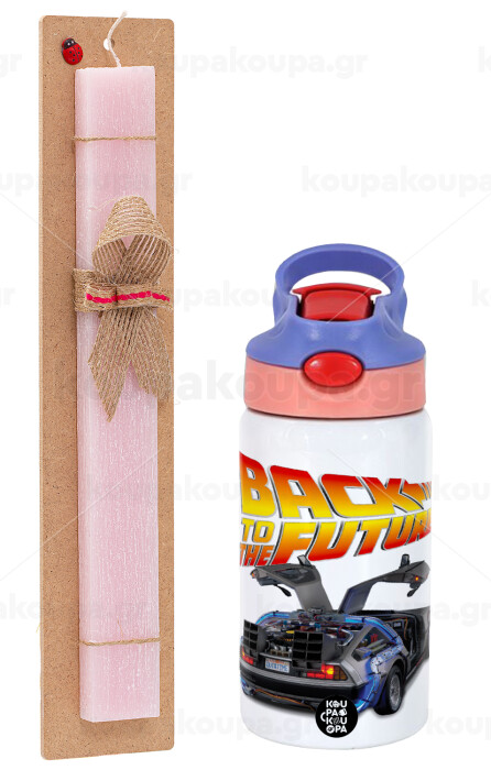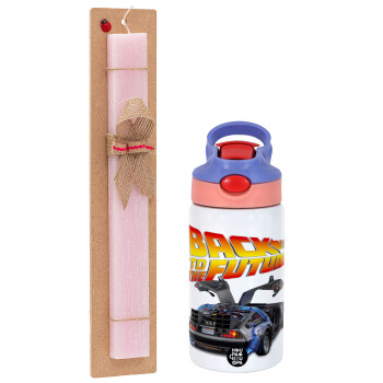 Back to the future, Easter Set, Children's thermal stainless steel water bottle with safety straw, pink/purple (350ml) & Easter scented flat candle (30cm) (PINK)