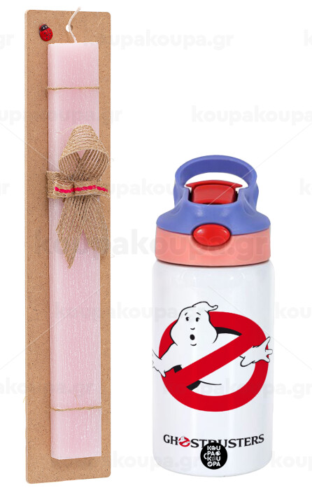 Ghostbusters, Easter Set, Children's thermal stainless steel water bottle with safety straw, pink/purple (350ml) & Easter scented flat candle (30cm) (PINK)