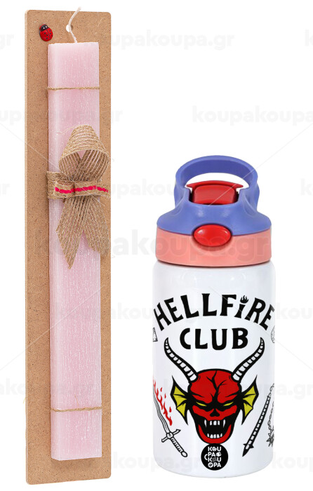 Hellfire CLub, Stranger Things, Easter Set, Children's thermal stainless steel water bottle with safety straw, pink/purple (350ml) & Easter scented flat candle (30cm) (PINK)