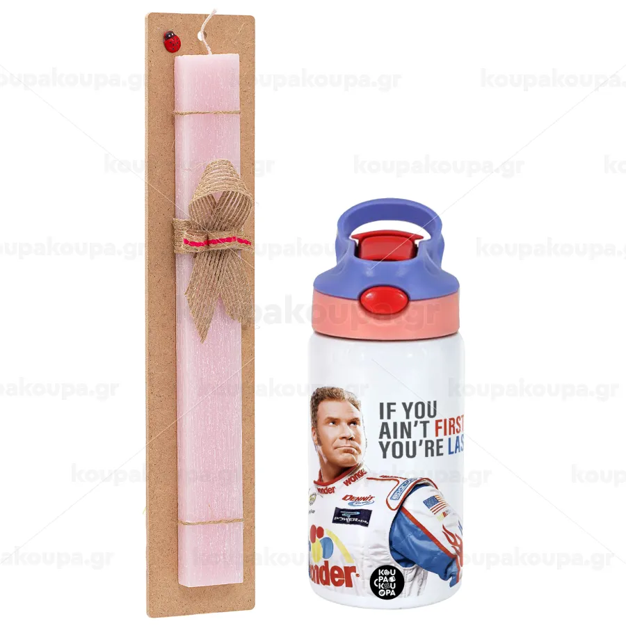 If You Ain't First You're Last Ricky Bobby, Talladega Nights, Easter Set, Children's thermal stainless steel water bottle with safety straw, pink/purple (350ml) & Easter scented flat candle (30cm) (PINK)