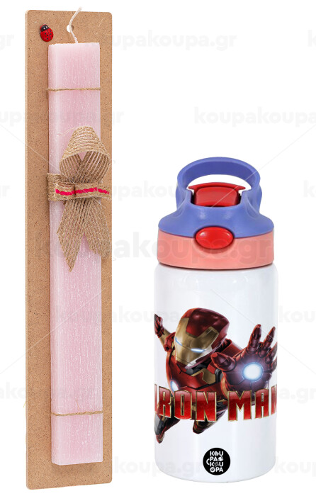 Ironman, Easter Set, Children's thermal stainless steel water bottle with safety straw, pink/purple (350ml) & Easter scented flat candle (30cm) (PINK)