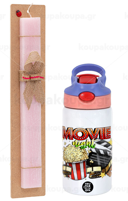 Movie night, Easter Set, Children's thermal stainless steel water bottle with safety straw, pink/purple (350ml) & Easter scented flat candle (30cm) (PINK)
