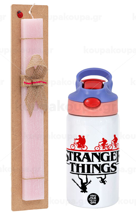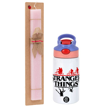 Stranger Things upside down, Easter Set, Children's thermal stainless steel water bottle with safety straw, pink/purple (350ml) & Easter scented flat candle (30cm) (PINK)