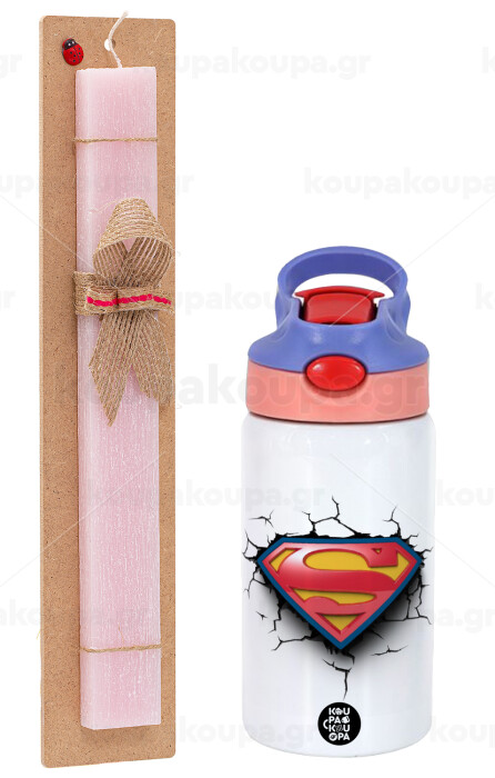 Superman cracked, Easter Set, Children's thermal stainless steel water bottle with safety straw, pink/purple (350ml) & Easter scented flat candle (30cm) (PINK)