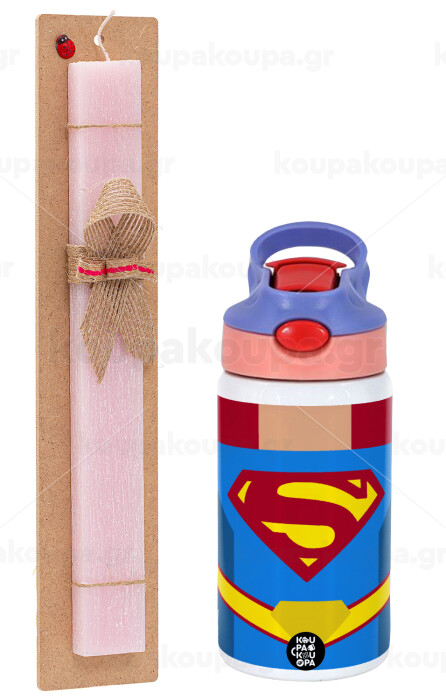 Superman flat, Easter Set, Children's thermal stainless steel water bottle with safety straw, pink/purple (350ml) & Easter scented flat candle (30cm) (PINK)