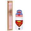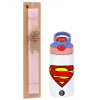 Superman vintage, Easter Set, Children's thermal stainless steel water bottle with safety straw, pink/purple (350ml) & Easter scented flat candle (30cm) (PINK)
