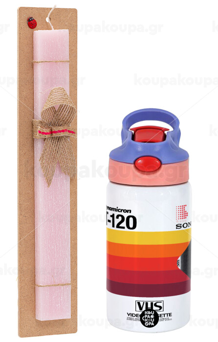 VHS sony dynamicron T-120, Easter Set, Children's thermal stainless steel water bottle with safety straw, pink/purple (350ml) & Easter scented flat candle (30cm) (PINK)