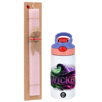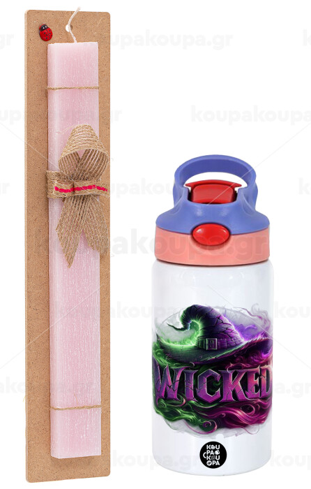 Wicked, Easter Set, Children's thermal stainless steel water bottle with safety straw, pink/purple (350ml) & Easter scented flat candle (30cm) (PINK)