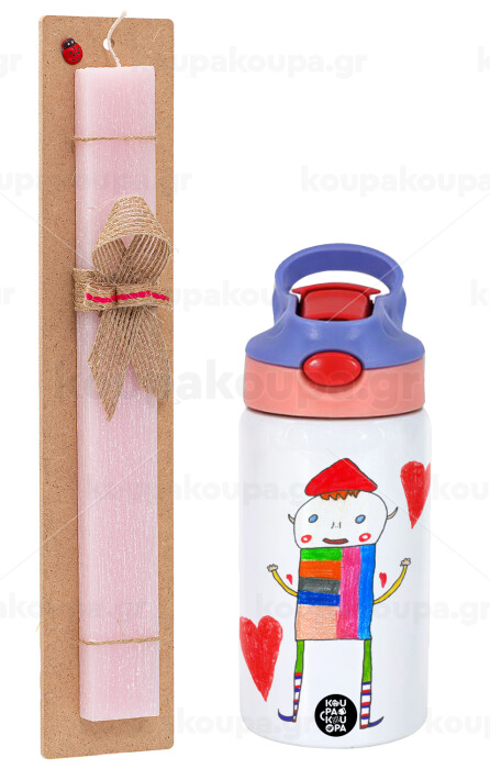 Ο Αλέξανδρος ζωγραφίζει την Αγάπη, Easter Set, Children's thermal stainless steel water bottle with safety straw, pink/purple (350ml) & Easter scented flat candle (30cm) (PINK)