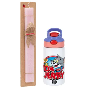 Tom and Jerry, Easter Set, Children's thermal stainless steel water bottle with safety straw, pink/purple (350ml) & Easter scented flat candle (30cm) (PINK)