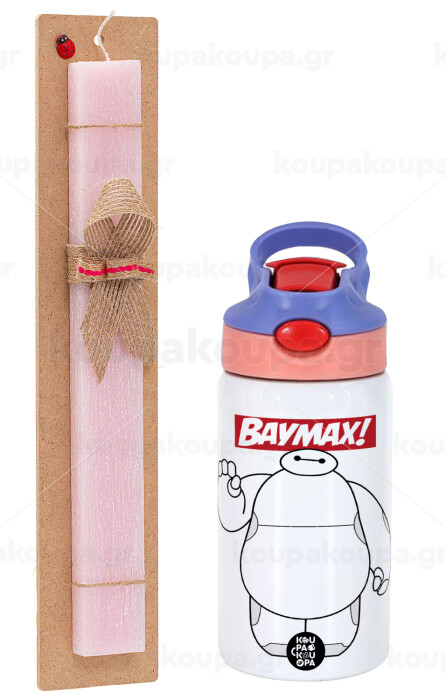 Baymax hi, Easter Set, Children's thermal stainless steel water bottle with safety straw, pink/purple (350ml) & Easter scented flat candle (30cm) (PINK)