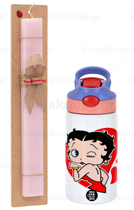 Betty Boop, Easter Set, Children's thermal stainless steel water bottle with safety straw, pink/purple (350ml) & Easter scented flat candle (30cm) (PINK)