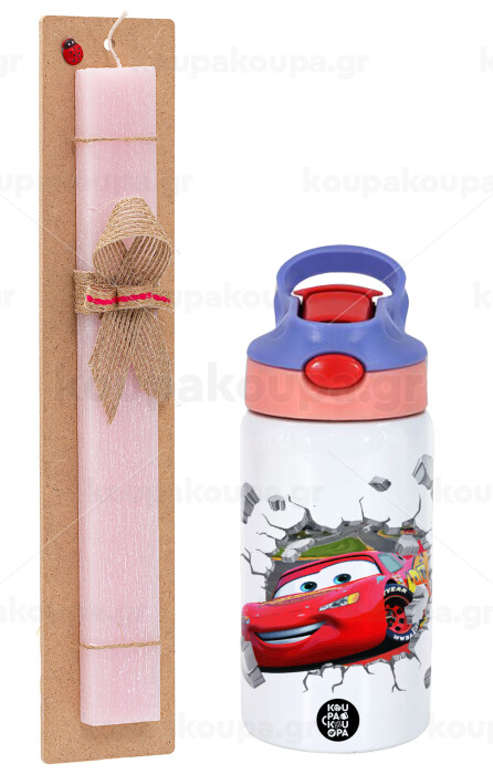 Brick McQueen, Easter Set, Children's thermal stainless steel water bottle with safety straw, pink/purple (350ml) & Easter scented flat candle (30cm) (PINK)