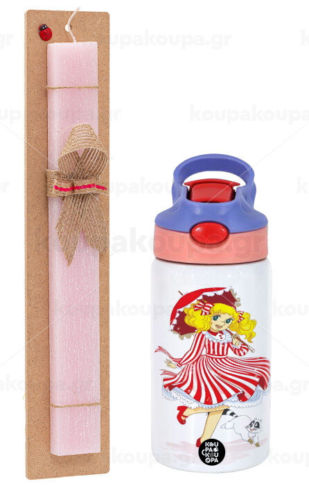 Candy, Easter Set, Children's thermal stainless steel water bottle with safety straw, pink/purple (350ml) & Easter scented flat candle (30cm) (PINK)