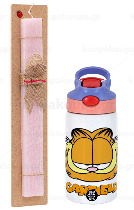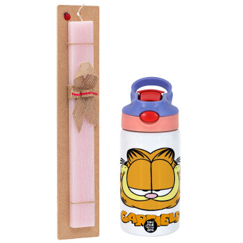 Garfield, Easter Set, Children's thermal stainless steel water bottle with safety straw, pink/purple (350ml) & Easter scented flat candle (30cm) (PINK)