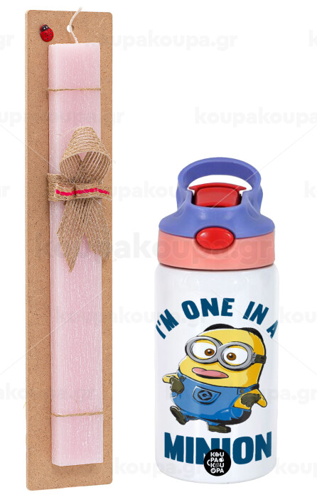 I'm one in a minion, Easter Set, Children's thermal stainless steel water bottle with safety straw, pink/purple (350ml) & Easter scented flat candle (30cm) (PINK)