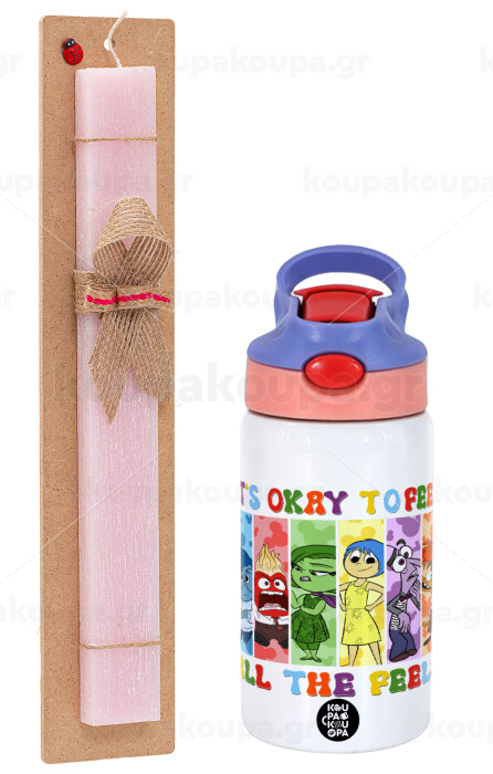 Inside Out It's Okay To Feel All The Feels , Easter Set, Children's thermal stainless steel water bottle with safety straw, pink/purple (350ml) & Easter scented flat candle (30cm) (PINK)