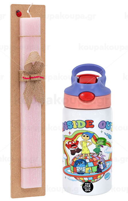Inside Out, Easter Set, Children's thermal stainless steel water bottle with safety straw, pink/purple (350ml) & Easter scented flat candle (30cm) (PINK)