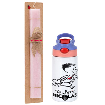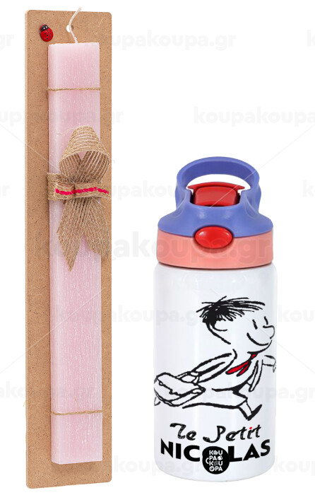 Le Petit Nicolas, Easter Set, Children's thermal stainless steel water bottle with safety straw, pink/purple (350ml) & Easter scented flat candle (30cm) (PINK)