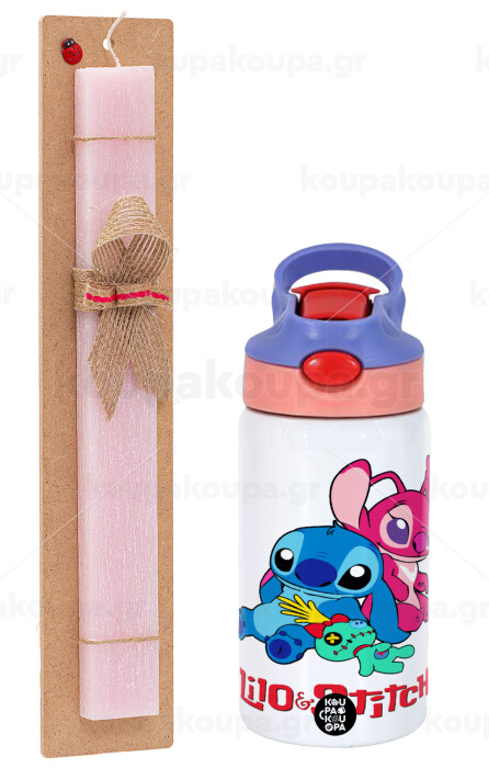 Lilo & Stitch, Easter Set, Children's thermal stainless steel water bottle with safety straw, pink/purple (350ml) & Easter scented flat candle (30cm) (PINK)
