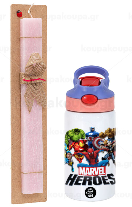 MARVEL heroes, Easter Set, Children's thermal stainless steel water bottle with safety straw, pink/purple (350ml) & Easter scented flat candle (30cm) (PINK)