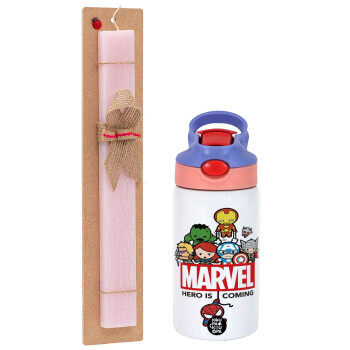 MARVEL, Easter Set, Children's thermal stainless steel water bottle with safety straw, pink/purple (350ml) & Easter scented flat candle (30cm) (PINK)