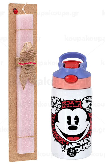 Mickey Mouse, Easter Set, Children's thermal stainless steel water bottle with safety straw, pink/purple (350ml) & Easter scented flat candle (30cm) (PINK)