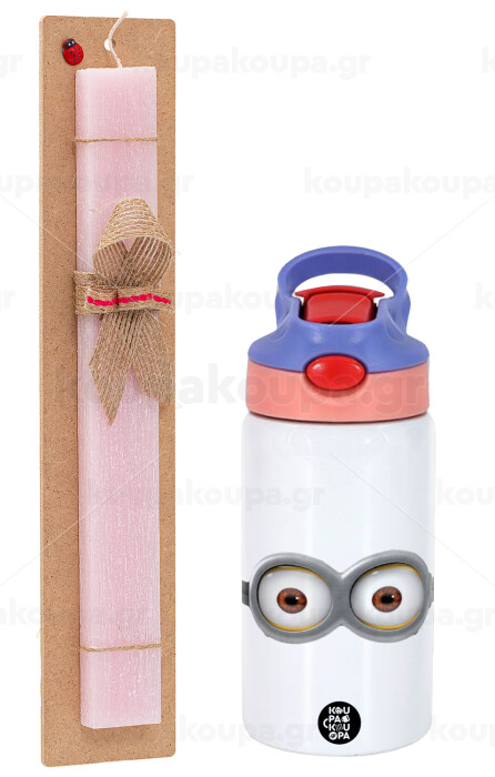 Minions, Easter Set, Children's thermal stainless steel water bottle with safety straw, pink/purple (350ml) & Easter scented flat candle (30cm) (PINK)