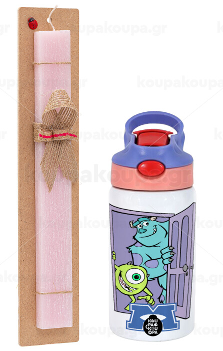Monster inc, Easter Set, Children's thermal stainless steel water bottle with safety straw, pink/purple (350ml) & Easter scented flat candle (30cm) (PINK)